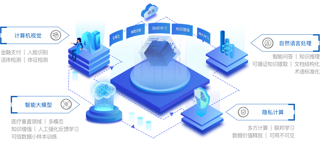 九州酷游官网以AI计算驱动业务,依托完全自主可控的计算机视觉、知识图谱、自然语言处理、隐私计算等核心技术等人工智能核心技术,赋能健康产业开展,形成数字健康新生态