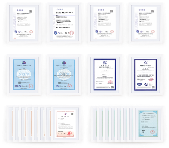 资质涵盖CMMI、信息安全、质量管理、安防设计、建筑智能化、⾳视频集成等。