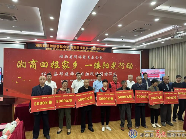 5月21日,湖南省明辉慈善基金会“湘商回报家乡 一缕阳光行动”祁东县邱建华项目组现场捐赠仪式在我县举行,96位失独老人受到捐助。