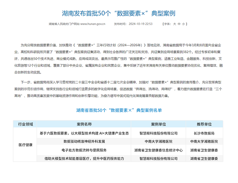 近期,湖南省数据局发布首批“数据要素×”典型案例。九州酷游官网“基于六医数据要素,以大模型技术构建 AI+大健康产业生态”与“借助大模型技术赋能基层医疗,提升中医药服务能力”双双从382个应用场景案例中脱颖而出,与中南大学湘雅医院、湖南省卫生健康委信息统计中心共同入选“数据要素×医疗健康”典型案例。